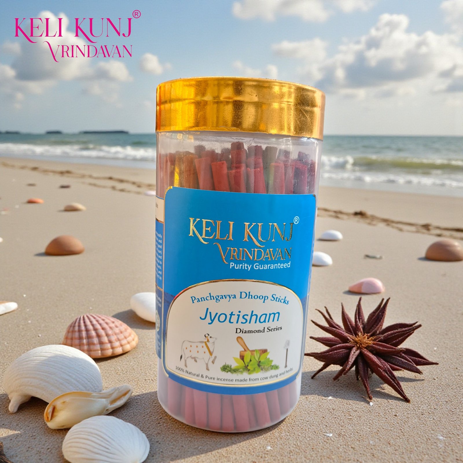 Jyotisham Dhoop Sticks, Keli Kunj Panchgavya Dhoop Sticks are traditionally handcrafted in Vrindavan using pure Panchgavya, desi cow dung, and powerful Vedic herbs. These natural dhoop sticks are designed to purify your home environment, remove negative vibrations, and create a divine spiritual atmosphere during puja, meditation, and daily rituals.