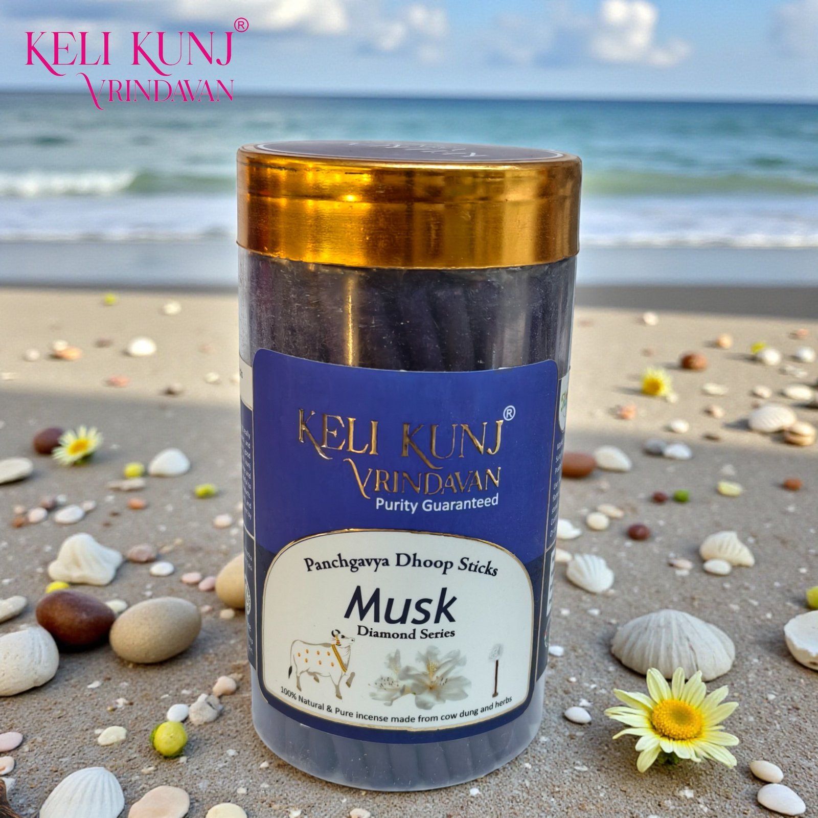 Musk Dhoop Sticks Keli Kunj Panchgavya Dhoop are traditional, handcrafted dhoop sticks made in Vrindavan using pure cow dung, natural musk essence, desi ghee, and sacred herbs. These dhoop sticks are chemical-free, charcoal-free, and 100% eco-friendly, offering a natural and divine fragrance for your home and spiritual practices.